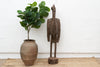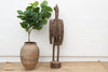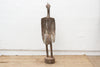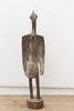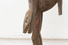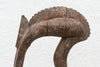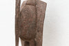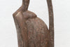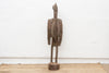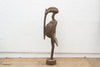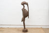 This impressive African sculpture depicts a tall hornbill, standing at 60 inches in height. The figure has an oxidized finish, giving it a weathered and aged appearance. Traces of original paint are visible, hinting at the colors and decoration that once adorned this piece, adding a layer of historical intrigue and visual texture. The hornbill, a bird of significant cultural importance to the Senufo people, is characterized by its distinctive long, curved beak. In Senufo cosmology, the hornbill often represents wisdom, longevity, and ancestral spirits.