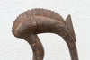 This hand-carved wooden sculpture captures the bird's form in a stylized manner. The oxidized finish suggests age and exposure, while the remnants of paint offer a glimpse into its past. Beyond its value as a collector's item, this antique African figure can bring a unique and grounding presence to a contemporary home or garden: Its intriguing form and potential history will undoubtedly spark curiosity and discussion. It can add an element of the unexpected when paired with modern furniture and art, creating a globally-inspired aesthetic.