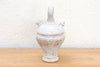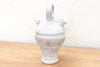 This magnificent Spanish terracotta jug is a powerful testament to the elegant functionality of traditional Mediterranean design. This authentic vessel, known as a Botijo or Cantaro, likely dates to the 19th or early 20th century and was originally used to naturally cool water through the porous clay. The classic form—with a sturdy pedestal base, central handle, and two functional spouts—is now beautifully accentuated by a distressed white painted finish. This chalky patina is perfectly worn, allowing the warm, earthy reddish-brown terracotta to peek through and adding a layer of authentic, sun-drenched history. Measuring 7.5 inches wide and 13.5 inches high, this historical piece serves as a striking tabletop vase for a dramatic floral arrangement, a sculptural accent, or a unique piece of folk art that celebrates the timeless style of the Iberian Peninsula.