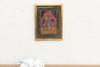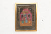 A vibrant piece of Indian devotional art, this small painting captures a classic scene from the life of Lord Krishna. The deity is depicted with his characteristic blue skin, playing the flute beneath a decorated archway. He is flanked by female devotees, and pots of butter or offerings hang suspended from the ceiling—a playful nod to Krishna’s childhood stories. The painting is executed in the folk style of Rajasthan, utilizing a high-contrast palette of pinks, teals, and yellows against a dark, night-sky background. It is framed in a vintage gilded wood frame that highlights the gold accents in the painting.