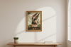 The vibrant coloring, distinctive figure, and high-quality gilded frame make this painting a spectacular decorative piece. It is perfectly suited for Traditional, Maximalist, or High-End Eclectic interiors, adding a concentrated layer of history and drama. Despite its smaller size (16" x 21"), the painting's rich gold-leaf frame and dramatic subject matter ensure it reads as a high-impact focal point. Place it above a small chest, within a niche, or as the centerpiece of a traditional gallery wall. The ornate, high-quality gilded frame is integral to the artwork, mirroring the gold details on the angel's clothing and enhancing the painting's antique luxury and visual weight.