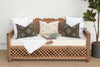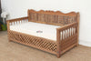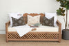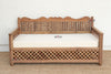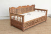An exotic Moroccan-inspired daybed with a Mousharabi lattice design. Mousharabi, is a traditional architectural element found in Morocco. It refers to a type of intricate lattice or screen design often used to provide privacy, filter sunlight, and create decorative patterns. Crafted from reclaimed teak wood with a chalk white finish, this hand-carved daybed exudes elegance and authenticity. The intricate Mousharabi lattice work on the back and front adds a touch of exotic beauty, while the open spindle work on the side panels enhances its visual appeal. Complete with a custom medium-density foam cushion, this grand lounge daybed offers both comfort and style.