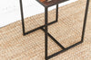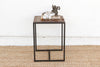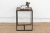 Discover a truly unique piece that marries diverse design elements to create a one-of-a-kind look: this small modern side table, measuring a versatile 15.5 inches square and standing at a convenient 20 inches high. This piece elegantly combines contrasting materials and styles, embodying a sophisticated rustic-modern aesthetic. The table features a sleek custom iron base with clean, thin lines and a dark, contemporary feel. This minimalist base provides a striking, almost architectural, counterpoint to the warmth of the solid wood top.