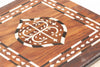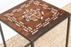 The tabletop itself is a testament to traditional artistry, featuring exquisite inlay work that forms a captivating medallion-center design. This intricate inlay, often found in traditional Indian or Middle Eastern craftsmanship, adds an authentic touch of global heritage, creating a beautiful focal point on the surface. The wood boasts a rich brown sealed finish, enhancing its natural grain and providing a tactile texture that invites touch.