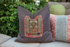 Crafted from fragments of exquisitely hand-embroidered tapestry adorned with intricate open-chain stitch embroidery, this pillow showcases a large patch of tapestry embellished with floral or geometric patterns, enhanced by small mirrors and complemented by solid gray-colored linen, creating a harmonious blend of textures and colors.The pillow is finished with a concealed zipper closure, a solid cream linen back and down-blend fill.