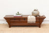 An elegant antique elm low Kang table. Measuring 59 inches wide, 15 inches deep, and 17 inches high, this piece showcases the simple elegance of traditional Chinese furniture design. Crafted from elm wood, known for its beautiful grain, this table features a low profile, characteristic of Kang tables, which were originally designed for use on heated platforms ("kangs") in northern China.