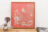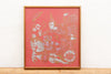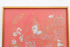 A captivating framed silk Thai painting. Measuring 18 inches wide and 20 inches high, this artwork depicts a scene featuring two stylized figures, likely dancers or characters from a traditional Thai narrative, rendered in a vibrant and detailed style. This piece is a hand-painted work, created with vivid colors upon a rose-red silk canvas. The use of silk as a medium lends a delicate texture and subtle sheen to the artwork, enhancing its elegance. The artist has employed a palette of strong reds, soft whites, and gilt details to create a visually striking composition. The gilt accents likely represent ornamentation, jewelry, or divine radiance, adding a touch of opulence and spiritual significance. The figures are adorned with distinctive pointed headdresses and ornate costumes, characteristic of traditional Thai theatrical or dance attire. The subject matter likely draws from classical Thai literature, mythology, or theatrical performances, reflecting the importance of storytelling and performance arts in Thai culture. Presented in a gold wooden stretcher frame, this silk painting is ready to become a focal point in your home.