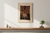 The embroidery showcases a complex grid of protective symbols and rhythmic borders, mounted onto a deep charcoal-black cotton ground that makes the colors and mirrors pop with architectural intensity. Professionally float-mounted on a textured cream linen field within a minimalist frame, this 35.5-inch vertical display transforms a piece of functional tribal dress into a monumental work of wall art. It is a perfect soul-piece for a Global Bohemian or Modern Rustic interior, offering a tactile history that is both raw and refined.