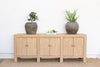 Fashioned from sturdy reclaimed wood, this sideboard carries the rich character of its past, with every grain, knot, and imperfection telling its own unique story. The natural wood finish has a beautiful, light hue, highlighting its stunning grain and rustic texture. This patina, along with the cabinet's clean lines and robust form, gives the piece a serene, grounded presence that feels both ancient and utterly modern, honoring the classic Ming Dynasty style.