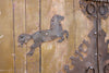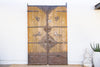 The highlight of this pair is the unique decorative metal layering at the bottom and top. The top frieze is particularly captivating, featuring circular cutouts and a central star motif, along with what appear to be carved or stamped symbols, adding a unique and specific narrative. The bottom is reinforced with a broad, rivet-studded metal plate, emphasizing its strength and durability. The reddish-hued iron, hand-forged and weathered, provides a powerful and striking contrast to the wood beneath. The subtle imperfections of the wood peeking through, and the timeworn texture of the metal, are not flaws but rather genuine hallmarks of the doors' authentic antique status. Their imposing scale and powerful design, dominated by the intricate metalwork, make them a captivating work of art, connecting to the nomadic and mountainous cultures of Central Asia.