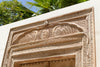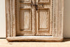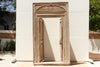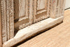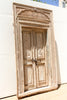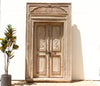 The sun-bleached finish highlights the wood's natural grain and intricate carvings, giving the piece a rich, authentic history that speaks volumes of its age and journey. With professional installation, this Antique carved door can be re-hung as a stunning and unique set of entry doors for a home or a feature room, making a bold statement. Place it against a prominent wall in a living room, dining area, or garden to create an instant architectural focal point that adds unparalleled texture and history.