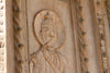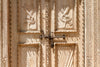 The door panels themselves are richly adorned. Most notably, figures of Krishna are beautifully carved, likely depicting scenes from his divine life and teachings. Krishna, a major deity in Hinduism, is revered for his love, compassion, and wisdom, making this door a spiritually significant gateway.