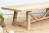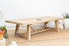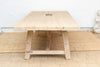 Inspired by the classic tavern tables of the French Basque region, this piece is expertly reconstructed from reclaimed wood, giving it a rich history and an eco-conscious soul. The tabletop is a substantial 3 inches thick, showcasing the unique grain, knots, and natural imperfections of the timber. The seal light finish proudly displays the wood's inherent beaut. The rustic dining table's sturdy foundation is a distinctive sawhorse stretcher base, a rustic and robust design that ensures stability and adds to its charming farmhouse style. This trestle-like construction, with its clean lines and confident stance, perfectly complements the expansive tabletop.