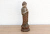 Expertly hand-carved from solid wood, this figure showcases the skillful artistry of its creator. The Buddha is depicted in a graceful standing pose, with hands clasped in a gesture of prayer or devotion, a pose that radiates calm and a gentle presence. The graceful folds of the robes, the serene expression on the face, and the iconic ushnisha atop the head are all meticulously rendered. The statue rests upon a beautifully carved lotus throne, a symbol of purity and enlightenment in Buddhist tradition.