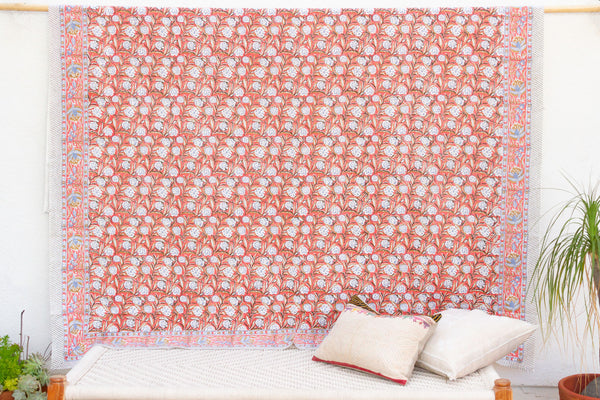 Coral Garden Bloom, Hand Blockprint Cotton Coverlet
