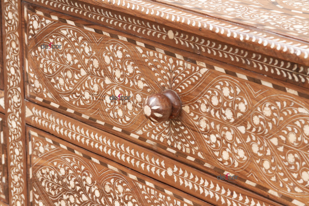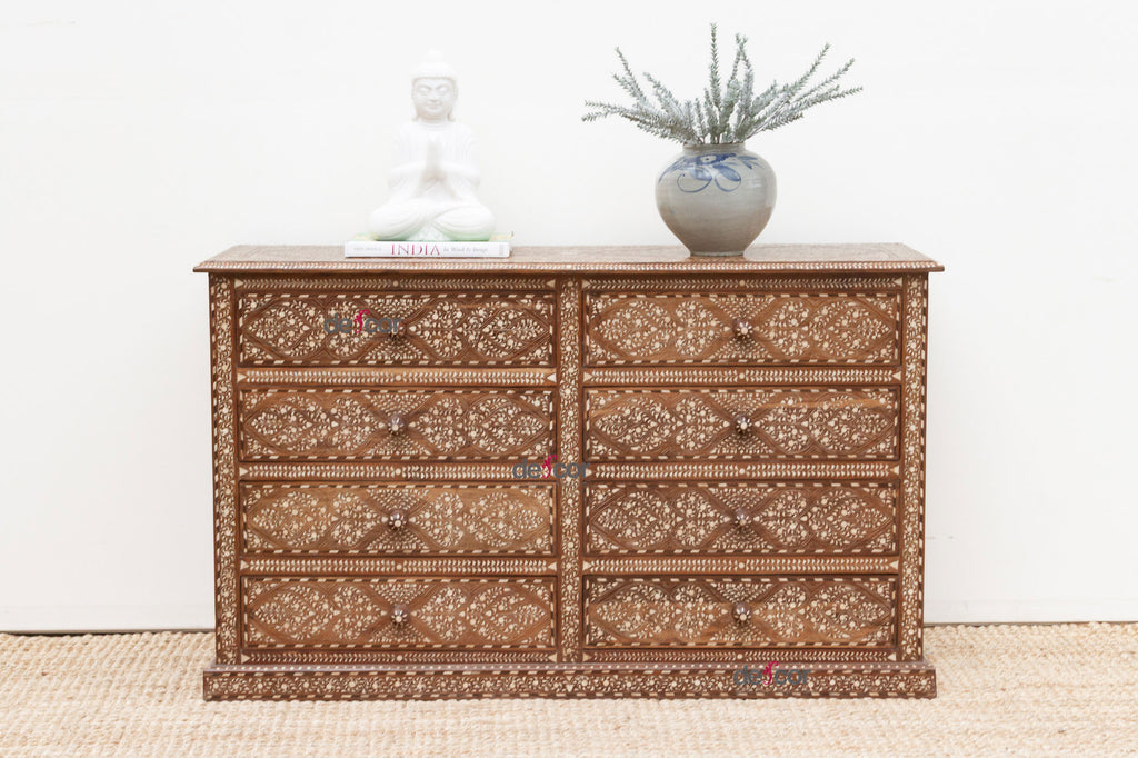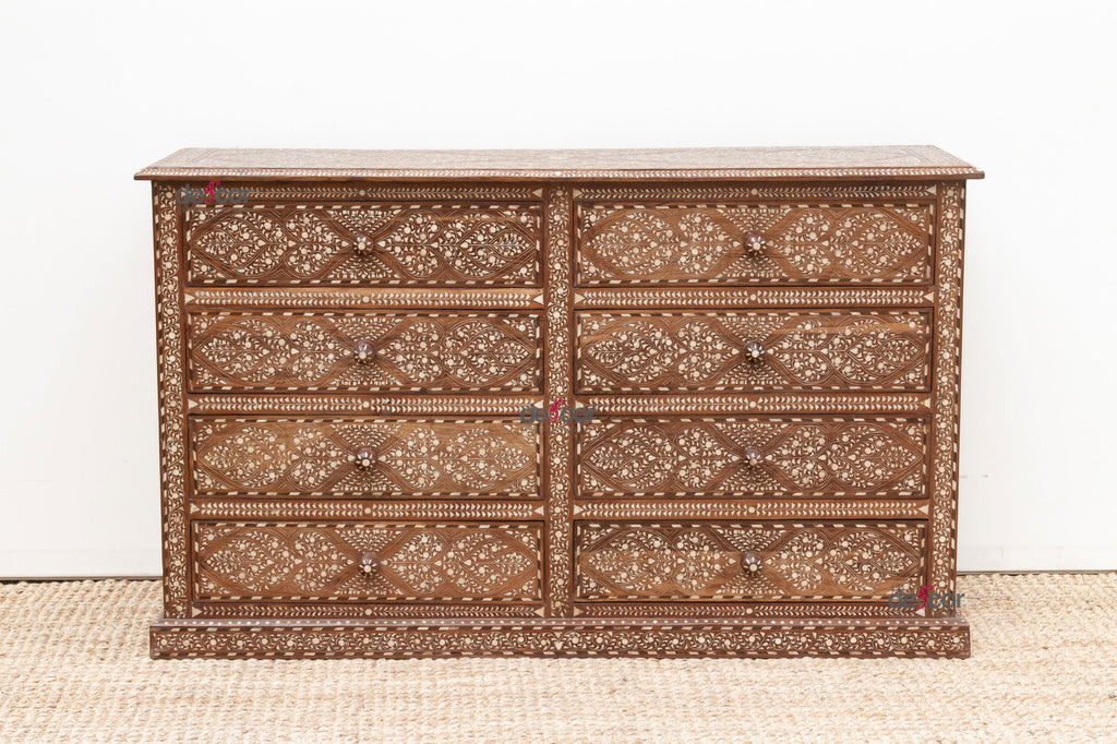 Introduce a sense of stately elegance to your bedroom with our beautifully inlaid dresser, a substantial piece offering exceptional storage and a touch of royal history. Featuring eight drawers and finished in a rich brown walnut patina, this dresser is adorned with exquisite inlay work, a technique historically favored in royal courts for its opulent and detailed aesthetic.