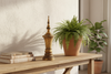 A relic of devotional art from Myanmar, this slender, towering object mimics the form of a Buddhist stupa or the ornate finial of a Hsun-Ok offering vessel. Crafted from wood and coated in traditional gold leaf, the body is adorned with Thayo work—a relief technique using molded lacquer paste to create intricate raised patterns. The central section features a diamond lattice design, originally inlaid with tiny shards of colored glass or mirror to catch the candlelight in a temple. The weathered gold finish gives it an ethereal, spiritual quality, showing the passage of time through its gentle fading. Because of its spiritual origins, it brings a sense of calm and mindfulness to a room, making it ideal for a quiet reading corner or meditation space.