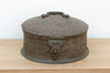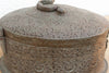 This piece is a tactile treasure map. Every inch of the surface is covered in hand-chased geometric and floral engravings. It features a rich, dark patina that hovers between aged copper and bronze, with hints of original red lacquer remaining in the deepest grooves—a hallmark of authentic antique Indian metalwork. The heavy latch on the front and the sculptural finial on the lid give it a sense of importance and security. It feels solid and substantial in your hands, not thin or tinny like modern reproductions. It’s the kind of box that begs to be opened to see what treasures are hidden inside. Originating from Northern India, this vessel dates back to the late 19th or early 20th century. Forms like this were traditionally known as a "Pandan”—an artisanal container used to store betel leaves, nuts, and spices (Paan) offered to guests as a sign of hospitality. In other contexts, they served as secure storage for family jewelry or coins. The meticulous etching reflects the Mughal influence on Indian design, where surface decoration was paramount.