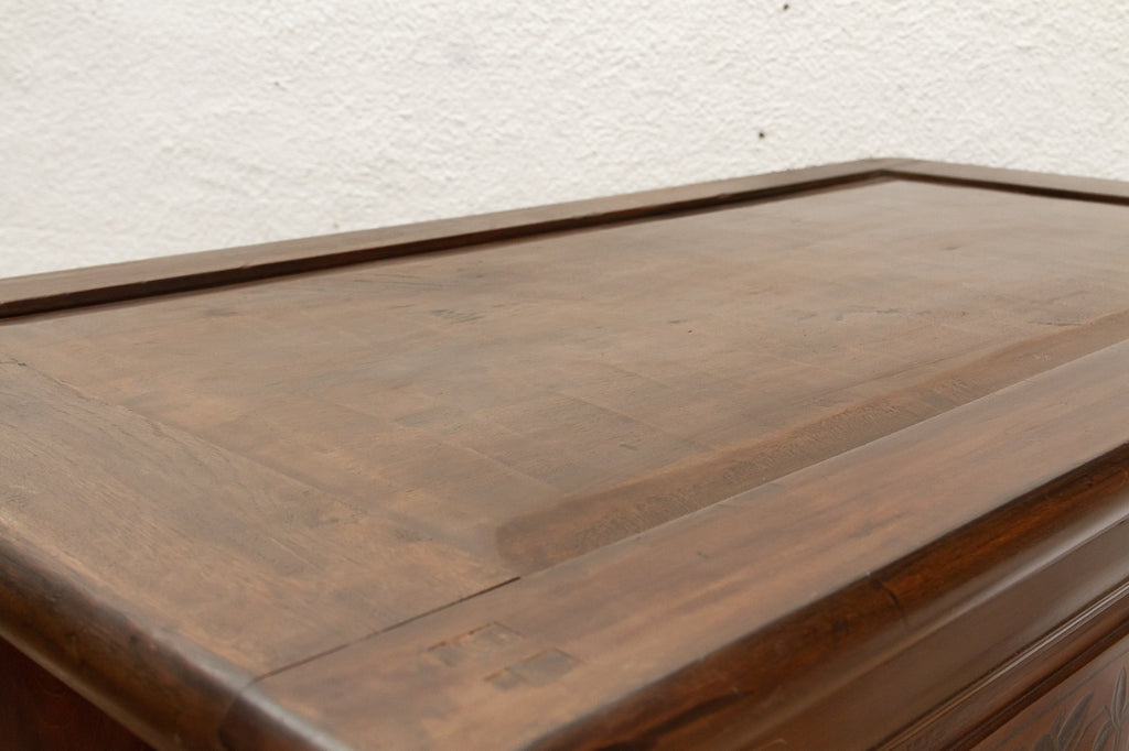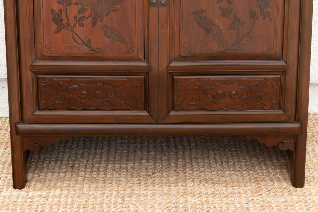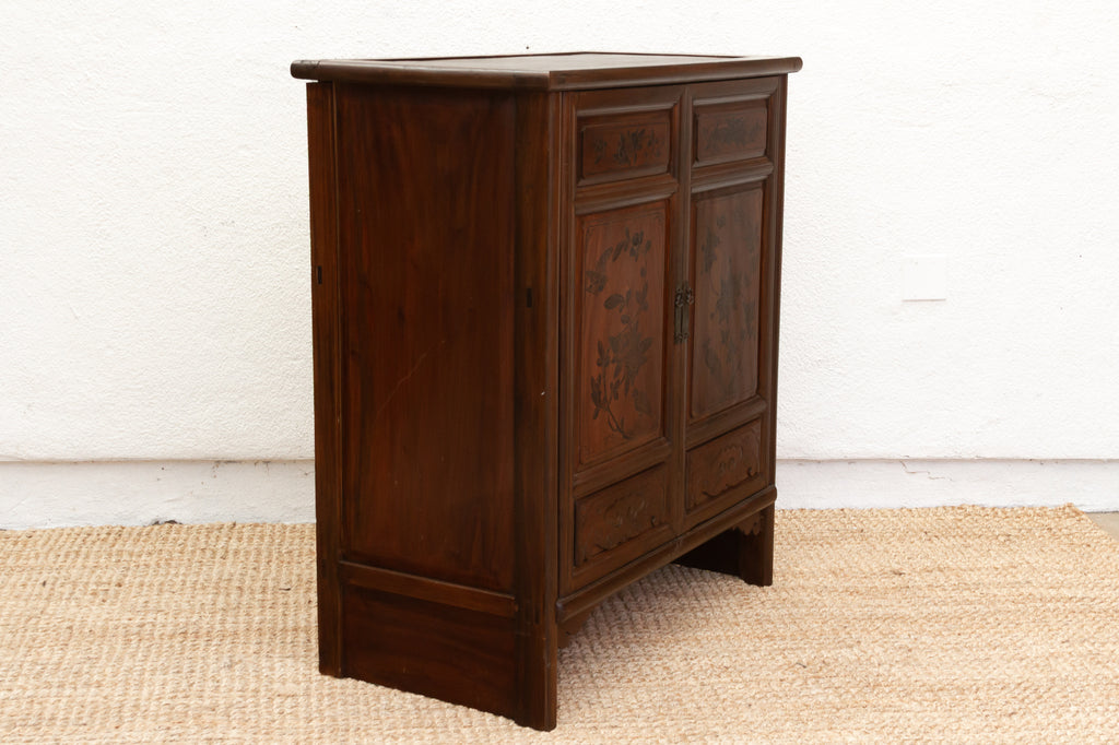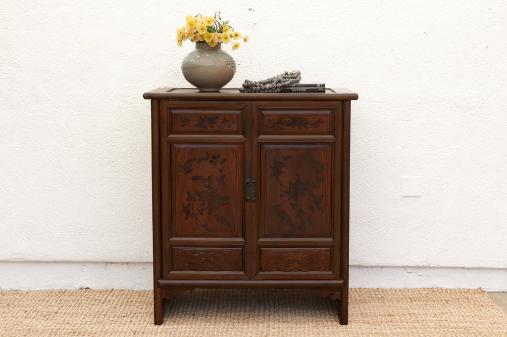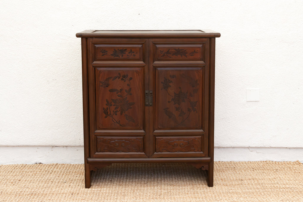 Introduce a touch of nature-inspired elegance with an exotic flair to your home with this striking Chinoiserie cabinet. Measuring 41 inches wide, 21 inches deep, and a substantial 46 inches high, this piece showcases the detailed artistry of Asian design with European influence. The cabinet features two doors, beautifully adorned with intricate floral and botanical engravings. These delicate carvings depict stylized branches, leaves, and blossoms, bringing a subtle yet captivating texture to the wood's surface. Offering ample storage space within, this antique cabinet serves as a stunning focal point, bringing a touch of Oriental charm and sophisticated detail to any room.