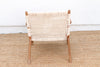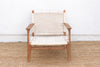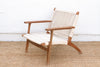 This chair is a beautiful tribute to a timeless design. The form, with its elegant, low-profile silhouette and strong, clean lines, is a direct link to the classic designs of the mid-20th century. This chair features a gracefully curved frame made from a warm-toned, natural wood, a perfect contrast to the finely hand-woven seat and backrest. This natural fiber weaving adds a beautiful, organic texture and a feeling of lightness and comfort. This chair is a celebration of sustainable materials and a commitment to elegant craftsmanship, proving that simple design is enduring. Originally used as a lounge or occasional chair, its versatile form and low stance make it perfect for a living room, sunroom, or reading nook. This wood and woven chair brings a sense of serenity and refined style to any home.