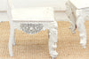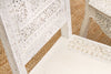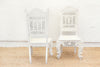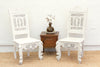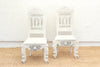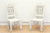 These chairs are evocative of the Anglo-Indian furniture produced during the British colonial period in India (roughly the mid-19th to mid-20th century). This style represents a fascinating fusion of traditional Indian craftsmanship with European forms and tastes. Local artisans, often highly skilled in carving intricate patterns, adapted their techniques to create pieces that appealed to the colonial administrators and residents. The use of dense hardwoods and elaborate carving, sometimes depicting local flora, fauna, or architectural motifs, are hallmarks of this style. The later addition of a white painted finish, often distressed, adds a layer of modern bohemian or shabby chic appeal, transforming these historically rich pieces for contemporary interiors.