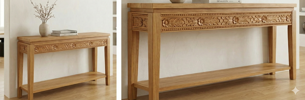 Custom 56”W x 22”D x 33” Carved Console Table with lower shelf