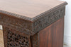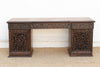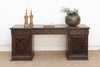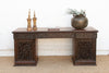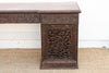 This monumental 72-inch executive desk is a rare masterpiece of Anglo-Indian furniture, representing the pinnacle of the 19th-century colonial aesthetic. Hand-carved from solid, dark-grained rosewood, the desk is entirely enveloped in an intricate grapevine and acanthus leaf motif. The architectural silhouette is defined by two massive pedestal towers featuring exquisite pierced-lattice (Jali) carving, which provides a sense of visual airiness despite the desk's significant weight and scale. The craftsmanship is extraordinarily high-relief, with the vines appearing to "grow" across the drawer fronts and side panels. This is not merely a workspace; it is a commanding sculptural statement for a primary study or library. Anglo-Indian furniture emerged during the British Raj, combining traditional Victorian and Regency silhouettes with the superior woodworking skills of Indian artisans. This desk features the classic pedestal (partner's style) design, but replaces European austerity with the lush, floral symbolism of the East. The use of solid, old-growth rosewood ensures the piece is incredibly dense and stable. The intricate lattice work on the pedestals was traditionally designed to allow for airflow in humid climates, protecting stored documents while showcasing the artisan's ability to "hollow out" the timber without sacrificing structural integrity. Dark trim along the base missing on both ends.