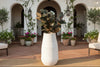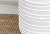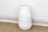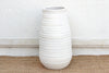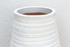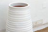 This elegant large terracota vessel emphasizes verticality and texture. Shaped like a tall, slender barrel it stands an impressive 33 inches high, making it a true floor-standing statement piece. It features deep, horizontal ribbing that wraps around the body, creating a tactile, beehive-like surface that catches light and shadow. The finish is a crisp, matte white that evokes the sun-bleached stucco of the Mediterranean. Unlike traditional urns, this piece has a clean, handle-free silhouette, giving it a more modern, minimalist edge.