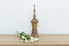 A relic of devotional art from Myanmar, this slender, towering object mimics the form of a Buddhist stupa or the ornate finial of a Hsun-Ok offering vessel. Crafted from wood and coated in traditional gold leaf, the body is adorned with Thayo work—a relief technique using molded lacquer paste to create intricate raised patterns. The central section features a diamond lattice design, originally inlaid with tiny shards of colored glass or mirror to catch the candlelight in a temple. The weathered gold finish gives it an ethereal, spiritual quality, showing the passage of time through its gentle fading. Because of its spiritual origins, it brings a sense of calm and mindfulness to a room, making it ideal for a quiet reading corner or meditation space.