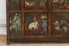 A museum-quality artifact from the Himalayas, this long cabinet is a testament to Tibetan devotional art. The cabinet front is divided into panels, each hand-painted with mineral pigments in muted earth tones, greens, and ochres. The artwork appears to depict a narrative featuring auspicious animals—including a white elephant (symbolizing mental strength and steadfastness) and a tiger (symbolizing awareness)—alongside seated lamas or deities. Unlike mass-produced furniture, the painting here is loose, spirited, and deeply symbolic, likely executed by a monk or village artisan. The piece serves not just as furniture, but as a storyboard of cultural folklore, preserved on solid wood that shows the authentic wear of centuries.