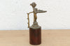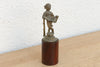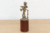 A charming piece of Indian vernacular metalwork, likely cast using the lost-wax technique found in tribal traditions. This small brass figure depicts a female attendant or devotee in a dynamic, cross-legged dance pose. She holds a shallow bowl or lamp in her right hand, traditionally used to offer light or blessings. The casting is somewhat naive and rustic, typical of folk bronzes, with simple facial features and stylized jewelry. Over time, the brass has developed a mellow, antique patina that contrasts warmly with the dark wood of the custom cylindrical stand.