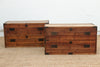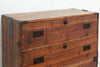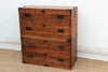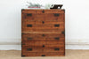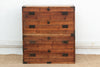 This elegant "chest-on-chest" is a fine example of a Japanese Kasane Tansu, a stacking clothing chest. Designed with mobility in mind—historically to be quickly moved,  it consists of two separate stacking sections that lock together. The chest features a warm, reddish-brown finish and is adorned with hand-forged bronze iron hardware. The flush-mounted rectangular handles and protective corner brackets give it that streamlined "Campaign" aesthetic while remaining distinctly Japanese in craftsmanship.