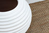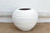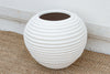This striking planter is a modern nod to classical Greek forms, updated with a clean, contemporary texture. Shaped like a generous sphere or "beehive," it features distinct horizontal ribbing that wraps around the entire vessel, adding depth and shadow play to its surface. Finished in a matte, chalky white, it mimics the look of sun-bleached Mediterranean plaster. It’s size makes it a significant architectural element rather than just a simple flower pot, perfect for housing large sculptural plants like snake plants or small olive trees.