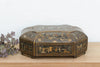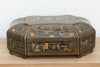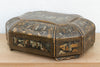 A lavish example of 19th-century Chinese Export art, this large presentation box was crafted in the workshops of Canton. It is defined by its "shaped" silhouette with chamfered, lobed corners and its surface, which is entirely covered in hand-painted gold gilt scenes. The artwork depicts bustling narratives of life in imperial courtyards—tiny figures chatting in pavilions, crossing bridges, and strolling through gardens—all rendered in delicate gold brushwork against a deep black lacquer ground. This style, known as Chinoiserie in the West, was the ultimate status symbol in Victorian homes, representing the mystery and wealth of the East. In a bedroom, it serves as a spectacular heirloom jewelry chest on a dresser, offering ample space for larger statement necklaces and watches that don't fit in standard velvet boxes.