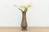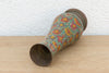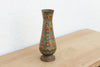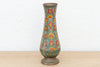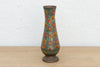 A vibrant example of traditional metalwork, likely hailing from the brass-working centers of Moradabad, India. This slender vase is crafted from solid brass that has been meticulously engraved with a repeating floral trellis pattern. The etched recesses are filled with matte enamel paints in a striking palette of teal green, crimson red, and saffron yellow, creating a rich, textural surface that feels both tactile and artistic. The exposed bronze-toned metal at the rim and base frames the colorful artwork, grounding the piece in its metallic origins. This vase is the ultimate one of a kind essential. Its slender profile (only 4.5 inches wide) allows it to fit into tight spaces on a bookshelf or a crowded mantelpiece where wider vases would feel clumsy.