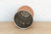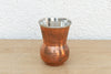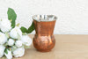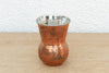 This petite vessel features the classic silhouette of a traditional Indian "Lassi Cup"—flared at the rim and bulbous at the base to fit perfectly in the hand. The exterior is crafted from copper with a distinct hand-hammered texture (martelé) that catches the light and hides fingerprints. Crucially, the interior features a silver-toned lining that rolls over the rim. This lining, historically tin (Kalai) but potentially stainless steel in newer iterations, was applied to make the copper food-safe and prevents the metal from reacting with liquids.