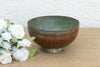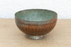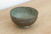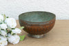 A petite treasure with immense character, this small footed bowl features a vibrant verdigris patina on the interior, contrasting beautifully with the warm, oxidized copper exterior. The outer rim is decorated with a hand-engraved band of primitive geometric cross-hatching and stylized floral motifs. Standing just 3 inches high on a sturdy pedestal foot, it feels like a personal offering vessel or a precious object from a lost era, perfect for holding small daily essentials.
