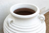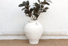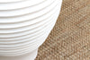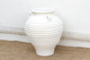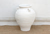 This impressive vessel is a contemporary reimagining of the ancient Greek Amphora or storage jar. Standing nearly 2.5 feet tall, it features a graceful, tapered silhouette that widens at the shoulders before narrowing into a distinct neck. The entire body is wrapped in deep horizontal ribbing, adding a sculptural, tactile quality that catches the light. Finished in a matte, chalky white, it mimics the look of traditional whitewashed Mediterranean stucco. Two small loop handles at the neck complete the classical look, bridging the gap between antiquity and modern minimalist design.