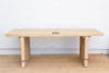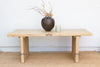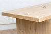 The table's sturdy foundation is a distinctive double slat pedestal base, a design that gives it a clean, modern look while ensuring stability. This trestle-like base with its angular supports perfectly complements the expansive tabletop, creating a compelling blend of primitive material and refined form.