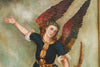 The vibrant coloring, distinctive figure, and high-quality gilded frame make this painting a spectacular decorative piece. It is perfectly suited for Traditional, Maximalist, or High-End Eclectic interiors, adding a concentrated layer of history and drama. Despite its smaller size (16" x 21"), the painting's rich gold-leaf frame and dramatic subject matter ensure it reads as a high-impact focal point. Place it above a small chest, within a niche, or as the centerpiece of a traditional gallery wall. The ornate, high-quality gilded frame is integral to the artwork, mirroring the gold details on the angel's clothing and enhancing the painting's antique luxury and visual weight.