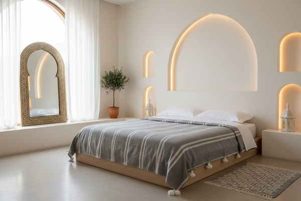 Dove Grey Striped Moroccan Pom Pom Blanket