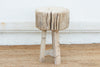 A simple, primitive base supports the heavy top, giving it a "milking stool" silhouette but with much more visual weight. While built like a stool, the uneven, historic surface of the log top makes this piece shine best as a Side Table or Structural Plant Stand. It is heavy enough to anchor a large ceramic pot or a stack of art books.