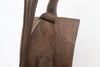 The aged finish of the wood, with its nuanced tones and textures, speaks to the sculpture's likely vintage or antique origins, suggesting a history imbued within the material and the carved inscriptions.