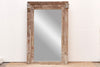 This truly majestic floor mirror is crafted from an exceptional antique door frame from India, dating back to the late 19th century. The beautifully aged, sun-bleached finish speaks to its long history in the vibrant climate of Rajasthan, a region renowned for its grand Havelis and intricate architectural carvings. Measuring an impressive 69 inches wide and 88 inches in height, it stands as a significant and historically rich statement piece. The weathered patina and the subtle textures of the wood, likely teak or a similar durable hardwood common to the region, tell a story of over a century spent exposed to the Rajasthani sun. Adding a unique and culturally significant detail, the top lintel of the frame features a pair of hand-carved elephants. In Indian culture, particularly in Rajasthan, elephants symbolize royalty, strength, wisdom, and good fortune, often adorning the entrances of important residences and palaces. These carvings offer a direct visual link to the doorframe's origin and the artistic traditions prevalent in Rajasthan during the late 1800s. The overall scale and the presence of the elephant carvings strongly suggest this doorframe once graced the entrance of a substantial Haveli or another significant building in the Rajasthan region.