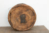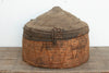 At nearly three feet wide, this monumental lidded grain basket is a remarkable artifact of nomadic history. Crafted to protect a family or village's most vital food supplies from the elements, massive storage drums like this were essential for surviving harsh environments and long journeys. Baskets of this scale took immense time and skill to weave, making them highly prized utilitarian heirlooms. Hand-woven from thick, natural grasses and reeds, this piece features a tightly coiled cylindrical base and a matching conical lid. The most striking features are the original agedhide stretched over the lid and rim for weatherproofing, alongside the antique, hand-forged iron hasps used to secure it closed. The interior shows the incredible precision of the concentric weaving, while the bottom edges reveal the raw, distressed plant fibers and dark patina that have survived decades of heavy use.