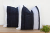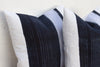This striking pair of decorative pillows captures the clean, graphic aesthetic of traditional hill tribe artistry. Each 20-inch square pillow is crafted from genuine vintage Hmong textile, a hand-woven cotton and hemp fabric sourced from the Hmong Hill Tribes of Southeast Asia. The design features a bold, wide vertical stripe pattern in deep indigo/black against a creamy white background, creating a high-contrast graphic that is both crisp and commanding. The subtle slubs and imperfections in the hand-loomed cloth are authentic hallmarks of its artisanal origin.