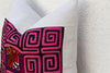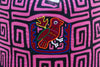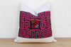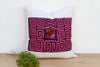 This spectacular decorative pillow is a museum-quality piece of textile art. The central panel is an authentic Mola, a traditional textile created by the Kuna people of Panama, famed for their intricate reverse appliqué technique. Likely dating to the mid-to-late 20th century, the Mola features a complex, layered geometric labyrinth in striking hot pink and black, surrounding a vibrant central bird motif. This hand-stitched process is highly labor-intensive and results in a tactile, high-relief design that seems to glow.