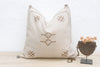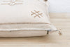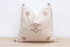 Indulge in the grounded beauty of our handcrafted Moroccan cactus silk pillow, measuring approximately 22 inches square. Woven from the resilient fibers of the Saharan aloe vera cactus, this large cushion features an organic linen-colored background that evokes the natural hues of the desert landscape. Adorning this serene canvas is a striking brown tribal embroidered design, meticulously hand-stitched by Moroccan artisans. The rich brown motifs stand out beautifully against the lighter linen tone, showcasing the intricate details and cultural significance of Berber artistry. This generous 22” square pillow will serve beautifully as a luxurious decorative accent piece to elevate your farmhouse, organic decor. Its substantial size and earthy color palette make it perfect for a grounding statement throw pillow on a sofa / bed: Adding natural warmth and a touch of global texture or a comfortable and stylish floor cushion for relaxed lounging: Providing earthy comfort in a casual setting. This exquisite handmade Moroccan throw pillow is more than just a cushion; it's a piece of Moroccan artistry that brings both comfort and organic style to your home.