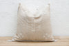 Indulge in the subtle beauty of our handcrafted Moroccan cactus silk pillow, measuring approximately 22 inches square. Woven from the resilient fibers of the Saharan aloe vera cactus, this large cushion features a background in a soft pearl white, reminiscent of aged natural materials. Adorning this serene canvas is a striking white tribal embroidered design, meticulously hand-stitched by Moroccan artisans. The crisp white motifs stand out delicately against the light background, showcasing the intricate details and cultural significance of Berber artistry. This large decorative Moroccan throw pillow will serve beautifully as a luxurious decorative accent piece to elevate your minimalist, coastal, or global-inspired decor. Its substantial size and refined color palette make it perfect as a calming statement throw pillow on a sofa or bed, or as a serene and stylish floor cushion for relaxed lounging. This large exquisite handmade Moroccan throw pillow brings both comfort and understated elegance to your home.