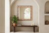 Showing clean contemporary lines contrasting with reclaimed teak and handmade inlay work. This beautiful boho modern mirror would be a staple in any home. Our blossom mother of pearl inlay collection is inspired by the opening of a lotus flower which is a symbol of purity and enlightenment. The reclaimed teak is hand-carved forming the flower shape, the inlay pieces are cut and carefully hammered into the wood to create the lovely lotus design.
